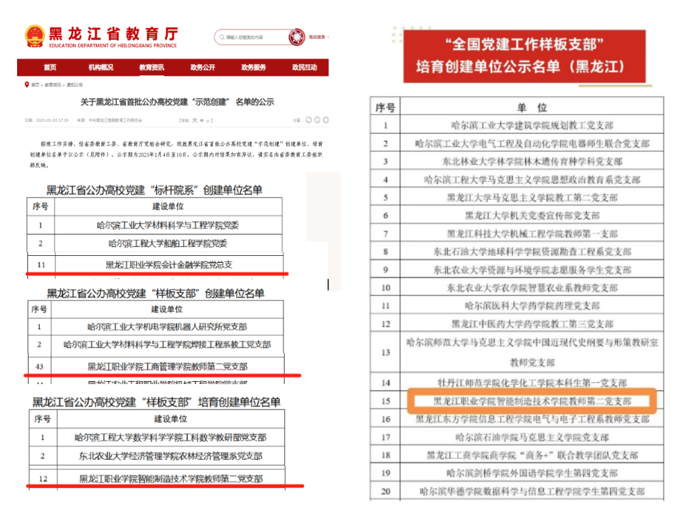 党建领航风帆劲,笃行实干结硕果。学校党委严格对照“六个过硬”要求,对标对表开展党建示范创建和质量创优工作,推动党建工作和业务工作深度融合。2023年,学校3个基层党组织获批黑龙江省公办高校党建“示范创建”单位和培育创建单位。2024年智能制造技术学院第二党支部入选“全国党建工作样板支部”培育创建单位、全国高校“双带头人”教师党支部书记“强国行”专项行动团队;农牧工程学院、数字商贸学院两个“双带头人”教师党支部入选全省高校“强国行”专项行动团队。累累硕果展现“龙职”新气象,骄人成绩彰显党建新作为。