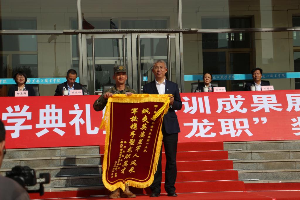武警哈尔滨支队与我校共建多年,为我校军训及国防教育工作做出突出贡献。为感谢部队多年的支持,王利文代表全校师生向武警哈尔滨支队执勤大队献旗。