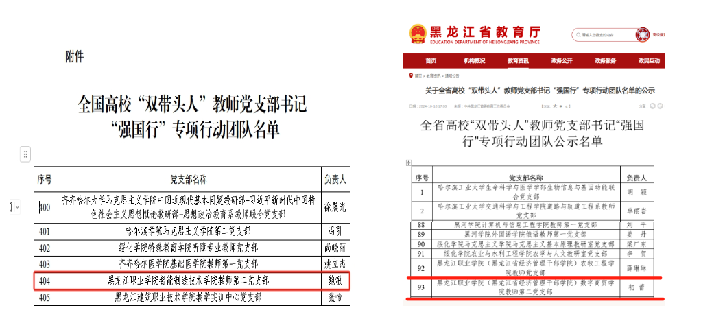 党建领航风帆劲,笃行实干结硕果。学校党委严格对照“六个过硬”要求,对标对表开展党建示范创建和质量创优工作,推动党建工作和业务工作深度融合。2023年,学校3个基层党组织获批黑龙江省公办高校党建“示范创建”单位和培育创建单位。2024年智能制造技术学院第二党支部入选“全国党建工作样板支部”培育创建单位、全国高校“双带头人”教师党支部书记“强国行”专项行动团队;农牧工程学院、数字商贸学院两个“双带头人”教师党支部入选全省高校“强国行”专项行动团队。累累硕果展现“龙职”新气象,骄人成绩彰显党建新作为。