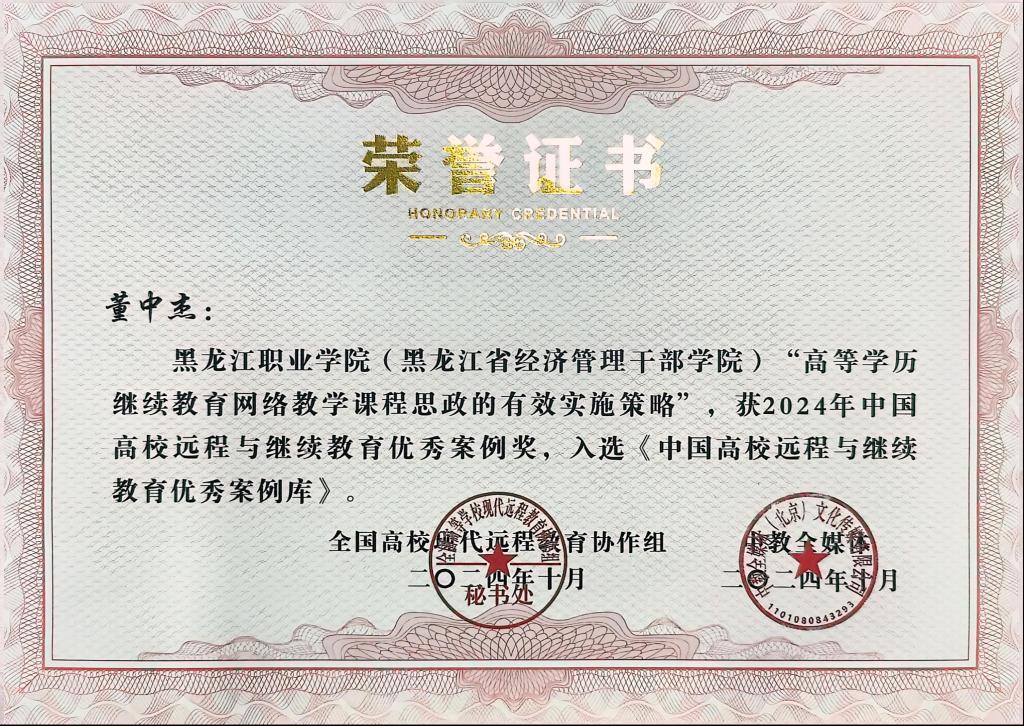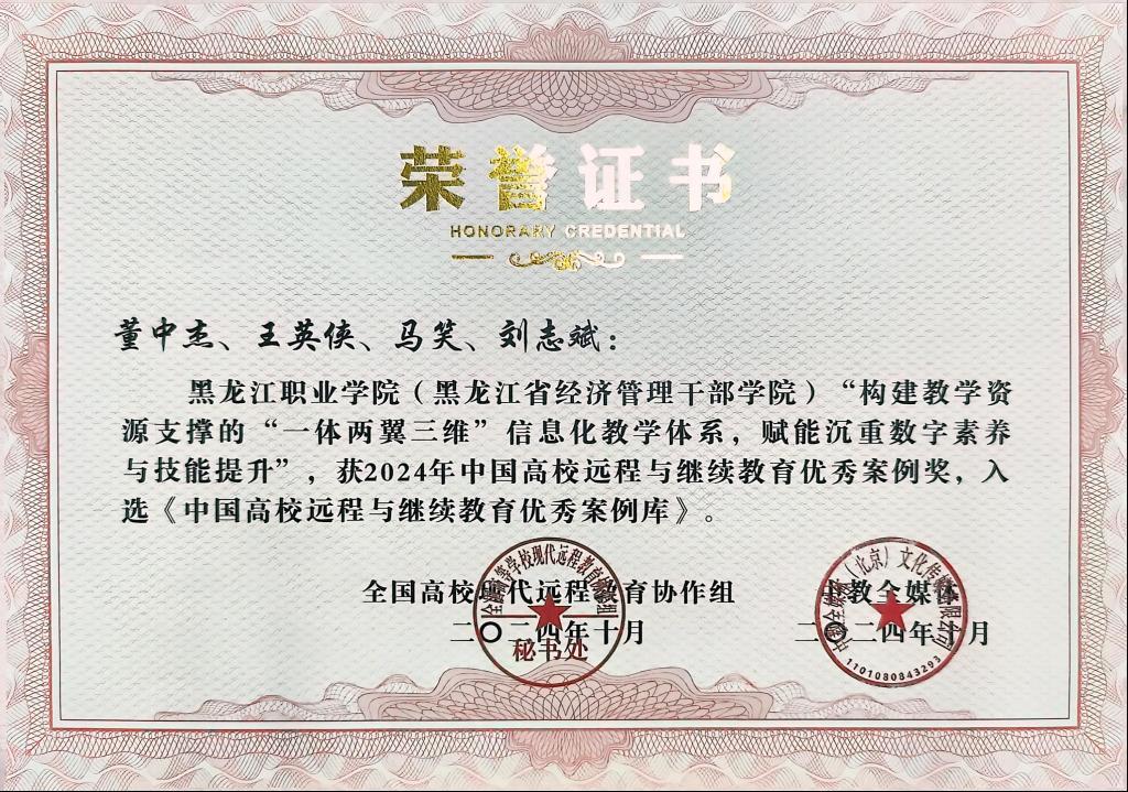 学院自建网络教学平台“龙知网”课程数量、课程质量、用户数量、服务范围均列省内同类型院校之首,《审计实务》等四门课程先后入选黑龙江省高等学校课程思政示范课程和教学团队。2024(第十届)中国远程与继续教育大会,我校成人学历教育斩获三项殊荣,校本部教学点荣获2024年度高校继续教育优秀教学点,申报的两项案例双双入选“中国高校远程与继续教育优秀案例库”。