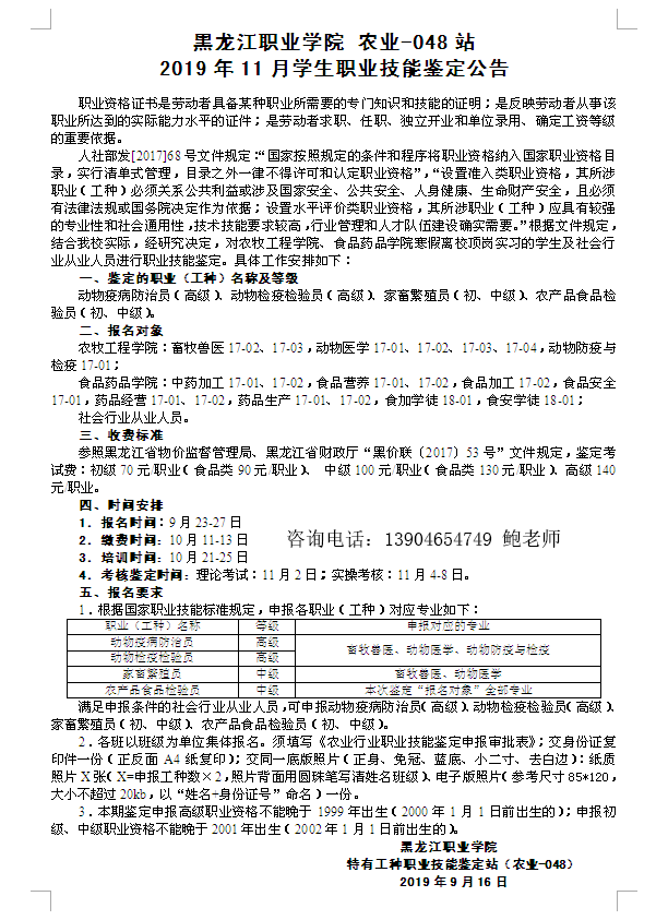 黑龙江职业学院农业-048站2019年11月学生职业技能鉴定公告