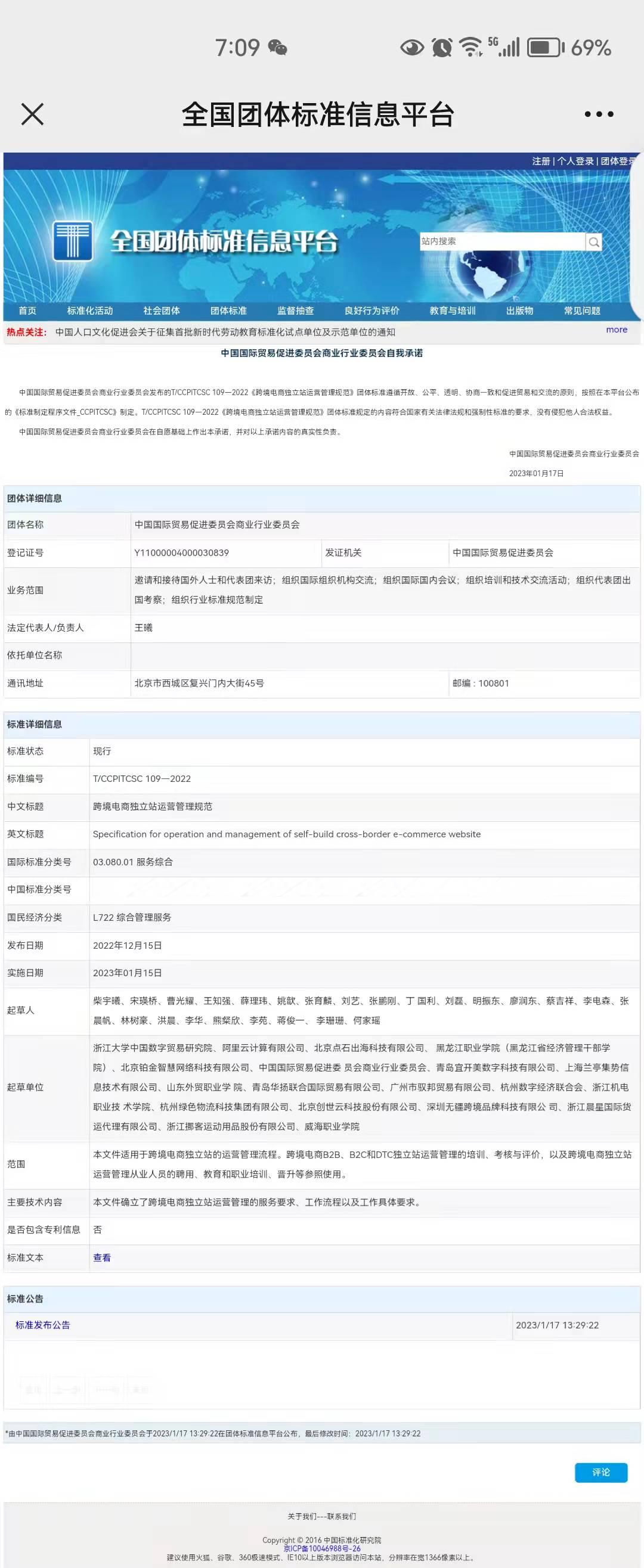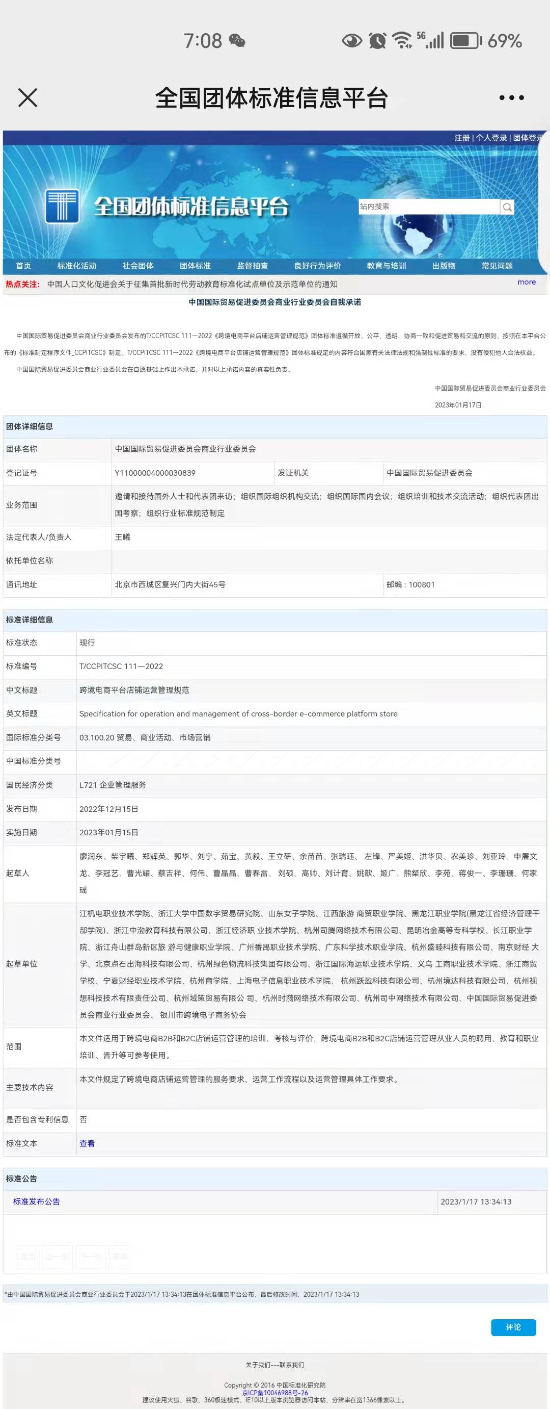 1月17日,由我校联合起草的“跨境电商新业态新模式运营管理规范”系列三项国家团体标准《跨境电商独立站运营管理规范》(T/CCPITCSC 109—2022)、《跨境电商海外仓运营管理规范》(T/CCPITCSC 110—2022)、《跨境电商平台店铺运营管理规范》(T/CCPITCSC 111—2022)在全国团体标准信息平台(http://www.ttbz.org.cn/)正式发布。本次发布的国家团体标准项目由浙江大学中国数字贸易研究院牵头制定,中国国际贸易促进委员会商业行业委员会立项管理。