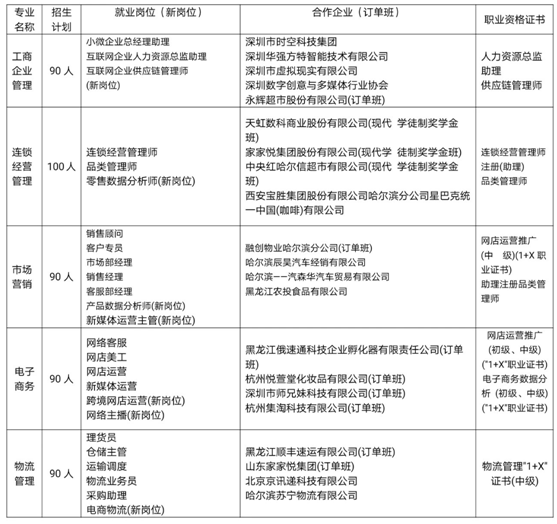黑龙江职业学院工管学院被誉为“龙江商贸经济的摇篮”。各专业均是“龙职”和“龙江”的品牌专业,是黑龙江省同类专业招生报考人气最旺的专业。工商管理学院引真实企业项目进校园,与黑龙江省电视台联合,与世界五百强零售企业、国内知名企业进行现代学徒制人才培养,为企业提供拥有商业大数据分析能力、项目运营管理能力、全渠道集客销售能力、数字化营销能力、新媒体技术应用能力、客户关系管理与运维能力、物流规划管理能力的复合型技术技能商业领域杰出人才!学生入学后经双向选择即可进入相应的现代学徒制班,实现入学即入职,毕业即就业。学院近3年初次就业率平均达90.16%,用人单位对毕业生满意率平均达95.06%,毕业生就业对口率平均达94.98%。毕业生分布北京、上海、深圳、杭州、昆山、黑龙江等地区,毕业三年后精英校友工作年薪达20万以上。