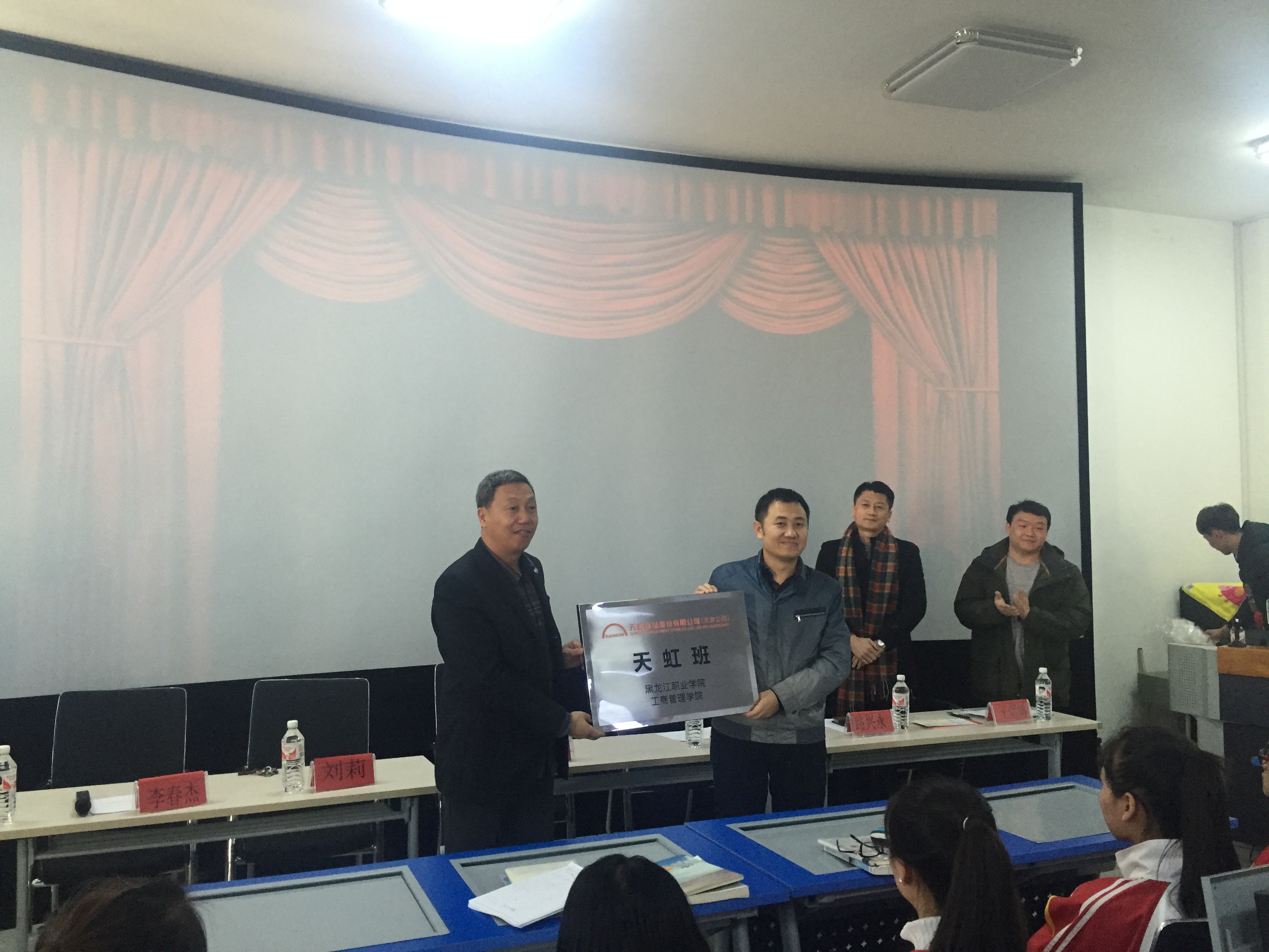 黑龙江职业学院连锁经营管理专业于2015年12月16日举办了“天虹班”开班典礼,参与人员有天虹商场股份有限公司力总监王宪军、天虹北京分公司行政总监路兴永、天虹北京公司招聘经理王熠博和工商管理学院党总支书记沈清涛、工商管理学院教学副院长刘莉以及2014级、2015级全体连锁同学。开班仪式由连锁经营管理专业团队带头人李春杰主持。