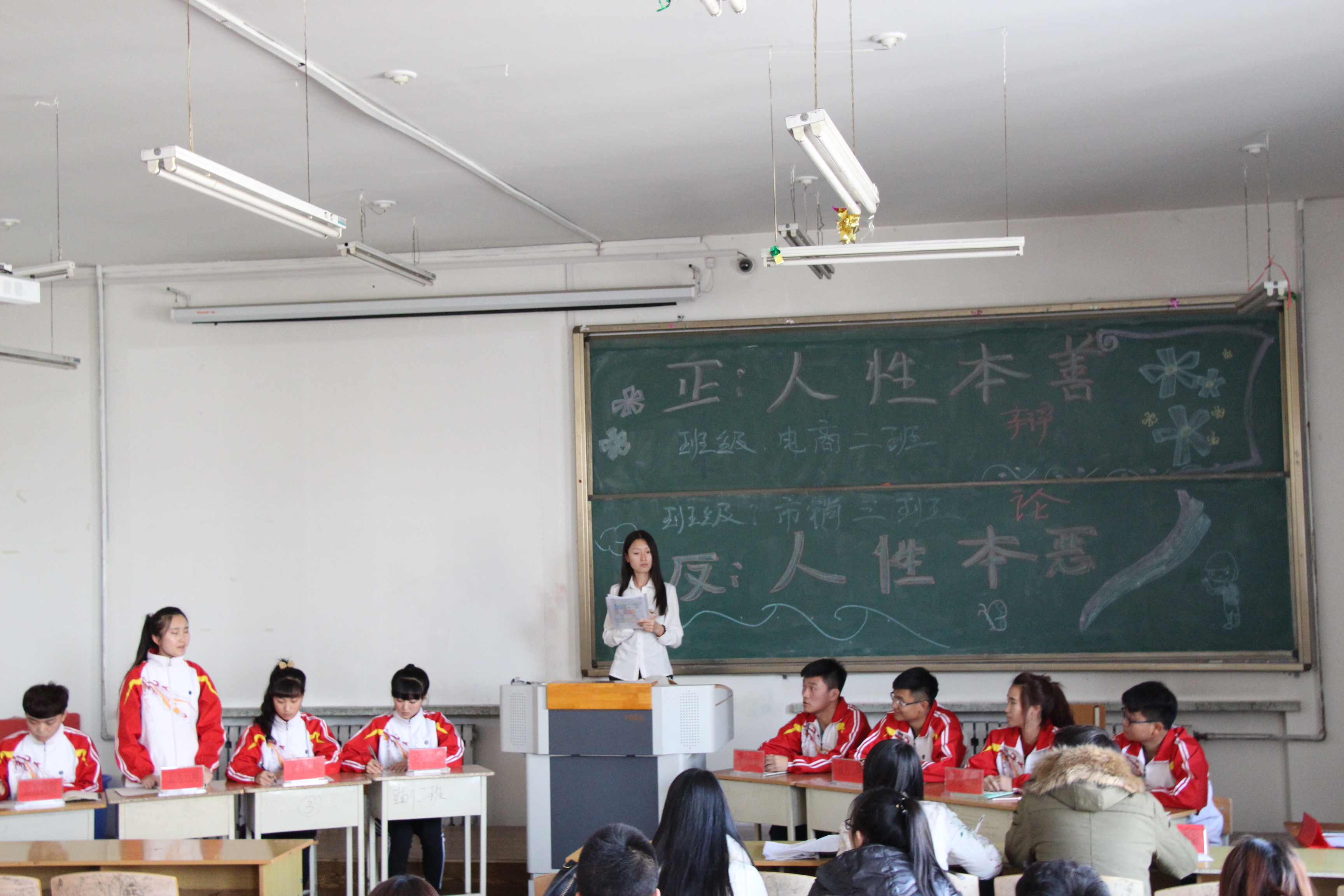 辩论赛是一个可以尽情施展才华的舞台,在为期近半月的辩论赛过程中,各班辩手们分别辩论了包含社会问题、个人生活、文化发展等题材的辩论题目,使辩手和观众都收获了不少知识和理论。他们在辩论场上唇枪舌战,纵横捭阖。每个班级之间的对决也是十分的精彩,一边是以舌为刃,口若悬河,一边是步步为营,稳扎稳打。一边有孔孟之道,以理论服人,一边有社会现实,用事实说话。辩论是大脑的游戏,它能增强我们的思维能力和逻辑能力,提高我们的临场发挥水平和语言组织水平,这是辩论的真正目的,也是我们举办辩论赛的初衷。