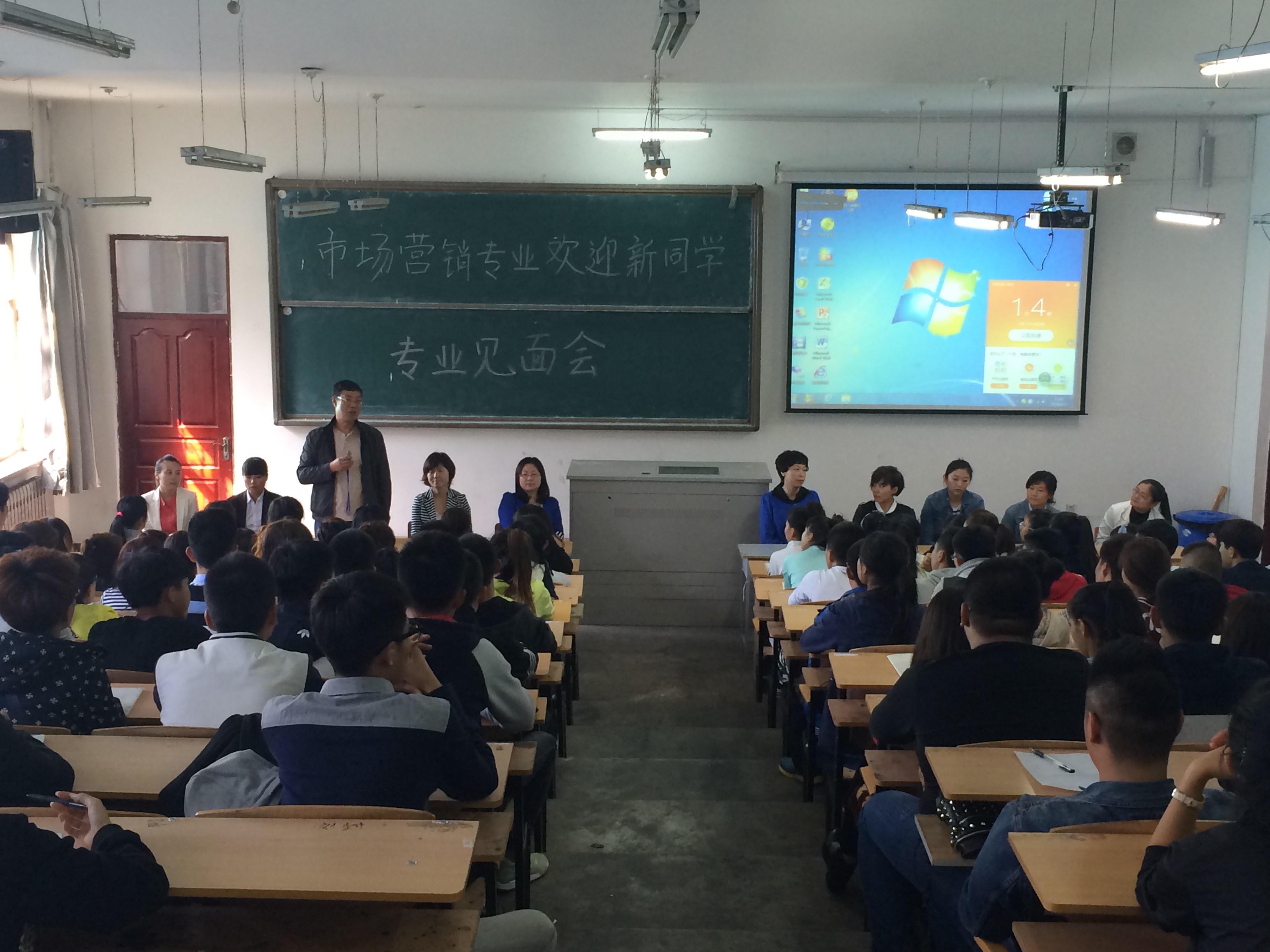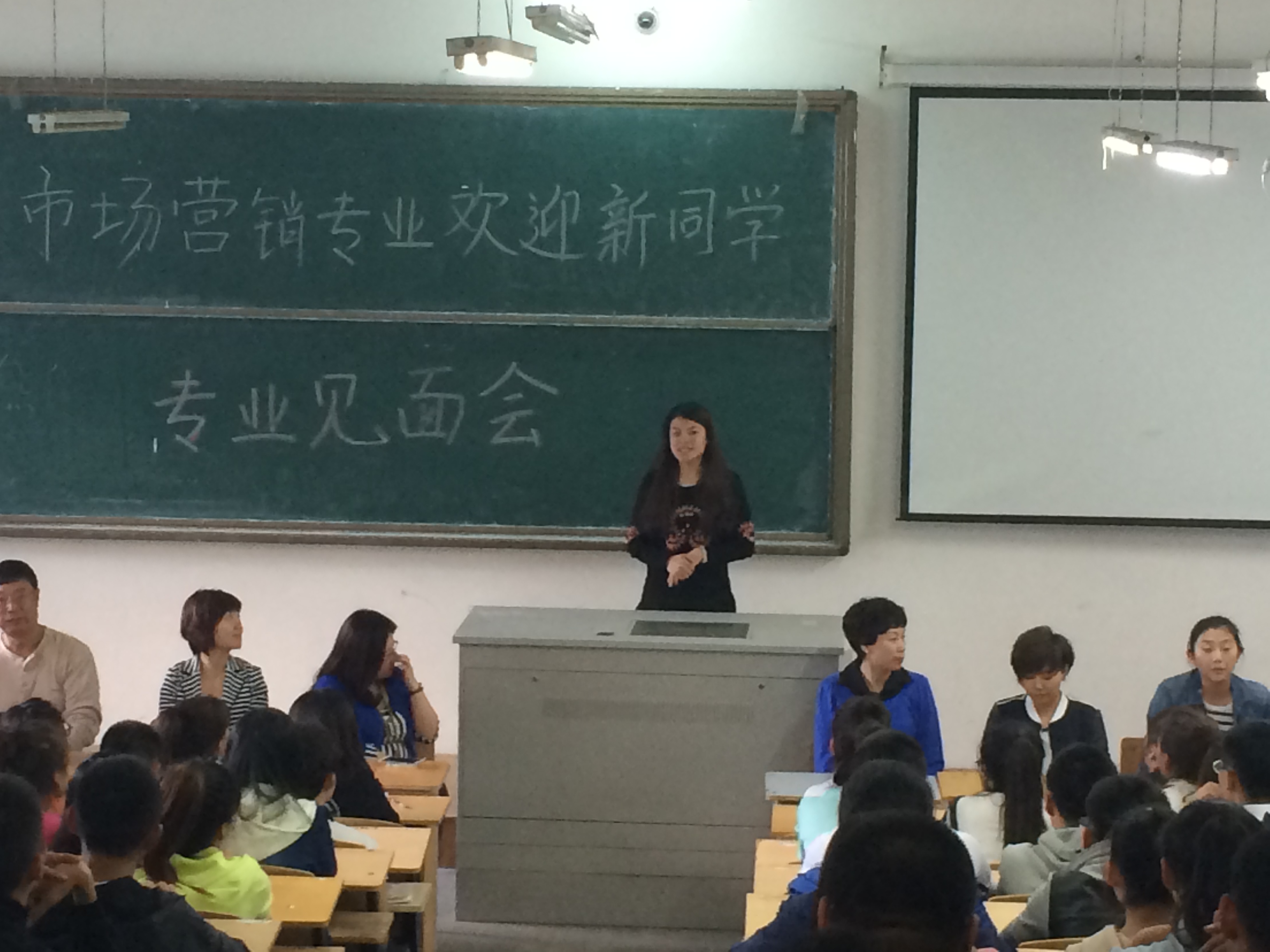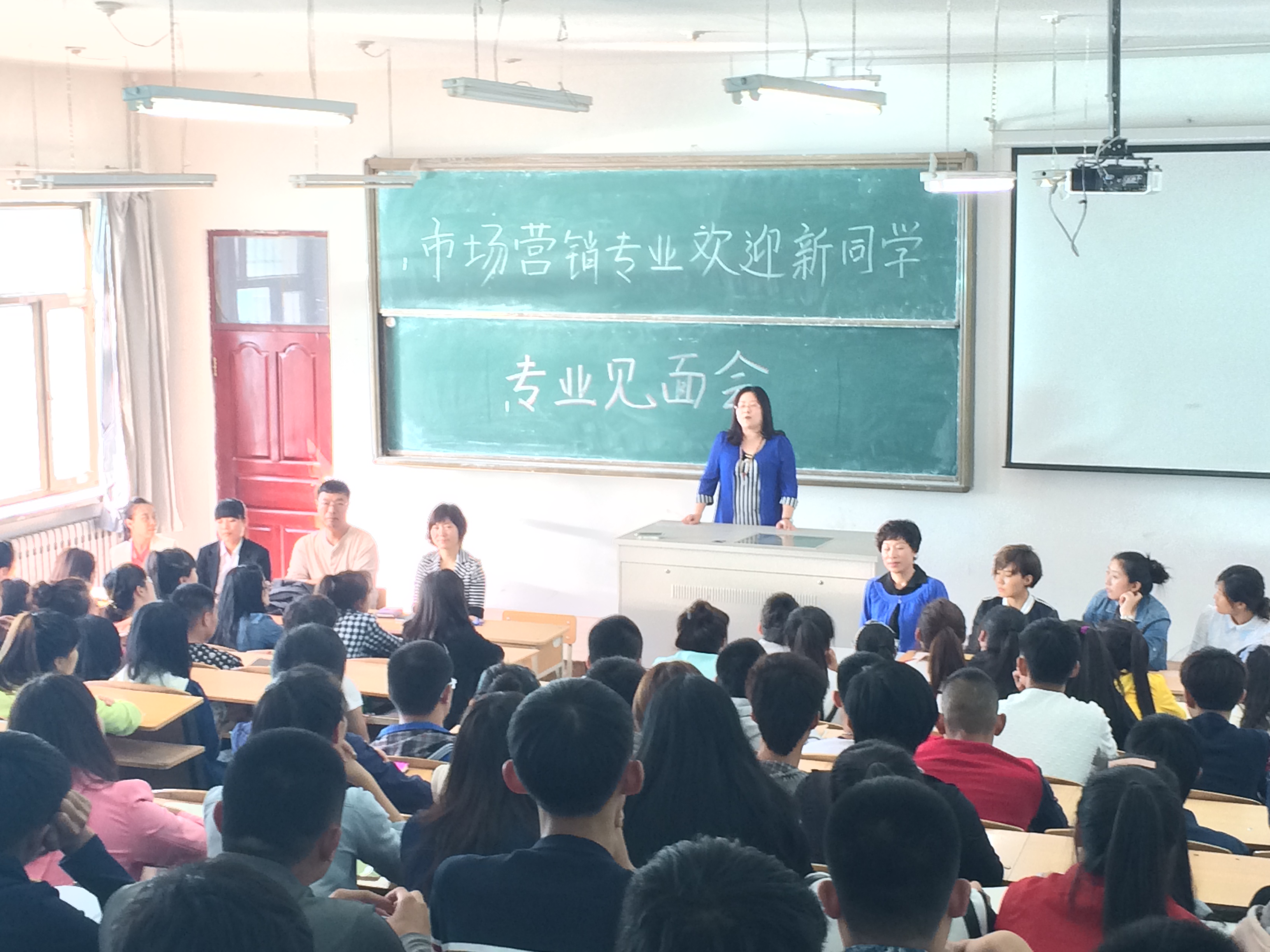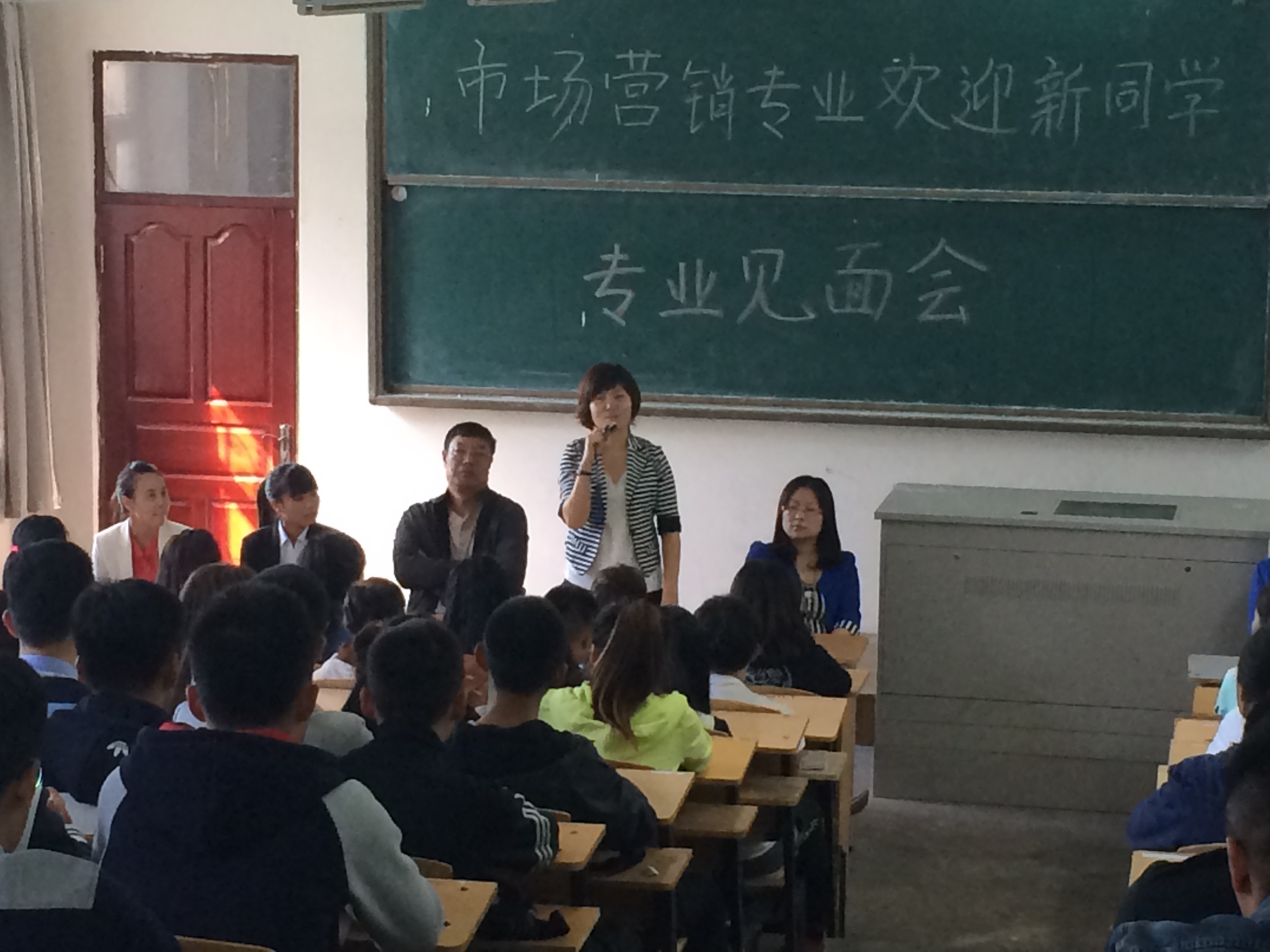 秋风送喜,龙职迎新。为了让我院14级市场营销专业学生明确专业学习目标、了解校园纪律,市场营销教学团队于2014年9月15日下午13时,在主楼西J101召开了新生见面会。此次大会由2014级营销专业辅导员于德洋老师主持召开,参加此次会议的主要成员有:市场营销团队带头人刘宁、专职教师刘晓岩、王慧、施海霞、王悦、孟璐、王海鹰、及黑龙江海升龙集团太古商城执行副总经理熊佳和昊业汽车集团有限公司销售顾问邴艳双,优秀毕业生张浩璇等特邀嘉宾。