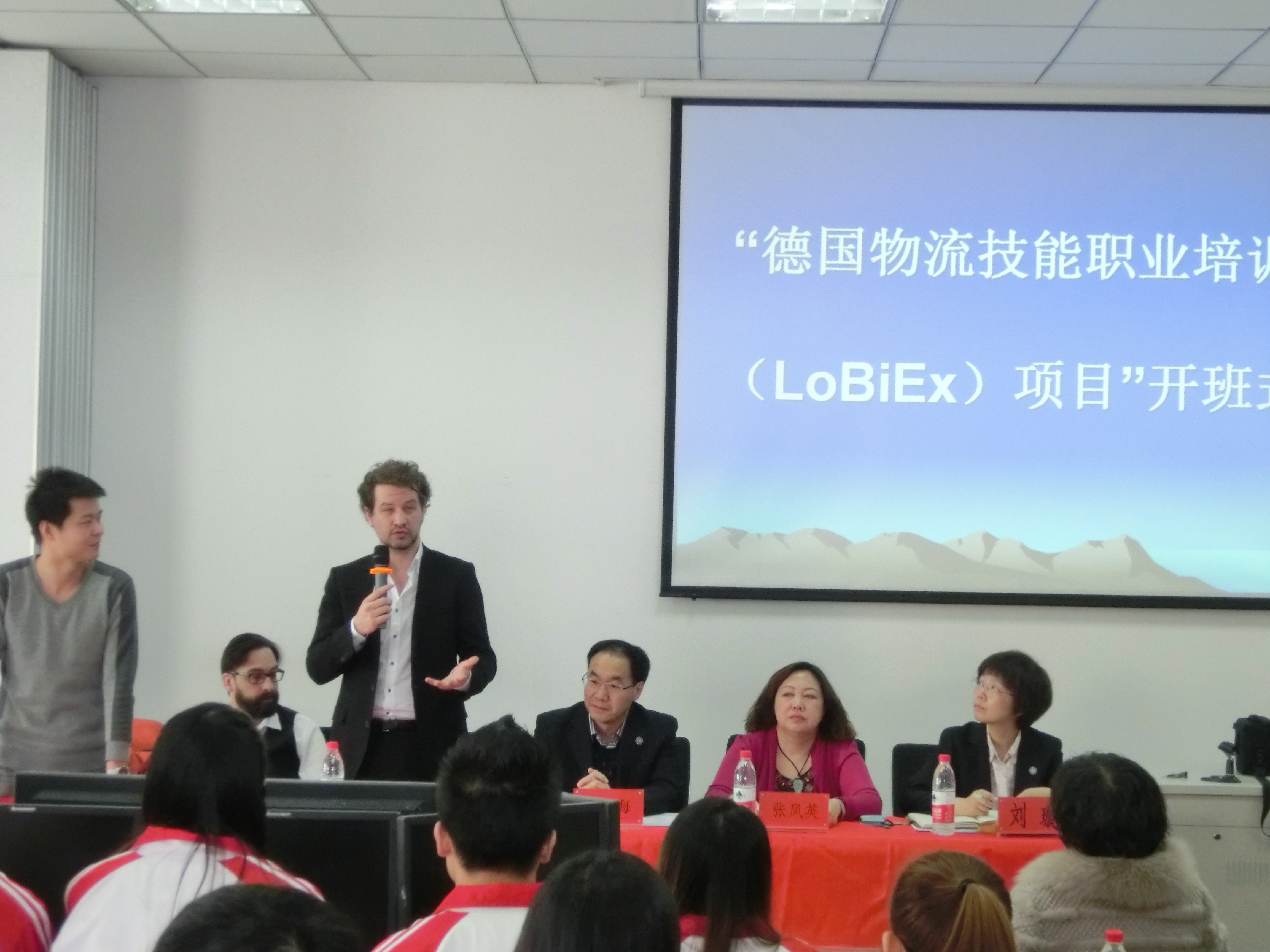2014年3月3日工商管理学院物流管理专业,在国际物流实训室举行了德国物流技能职业培训开班仪式。出席本次开班仪式的有黑龙江职业学院教学院长王明海、工商管理学院院长张凤英、教学副院长刘璇、德国代表史密斯先生,企业代表:中铁快运、北大荒物流、龙丹乳业、哈龙运物流园区等以及物流管理专业的老师和12级20名物流管理专业的学员。本次开班仪式由物流管理专业带头人刘莉老师主持。
