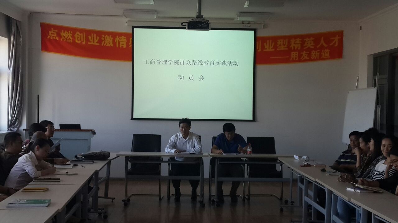 2013年9月3日下午13点30分,工商管理学院在主楼创业教育专用教室召开党的群众路线教育实践活动动员大会。工管学院院长张凤英、书记董庆波、学管院长孙亮和教学院长刘璇及全体教师出席了会议。