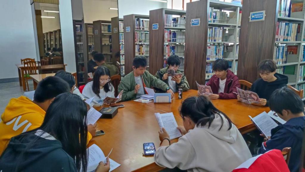 活动中,同学们走进图书馆多功能视听室及各个书库,通过角色扮演、阅读互动、逻辑推理等环节,身临其境地了解图书馆,沉浸式地参与这种新的书香文化体验,感受阅读带来的快乐。“图书馆+剧本杀+意识形态正向引导”的跨界融合,将正确世界观与校园文化元素打造成可读、可观、可感的剧本解谜游戏,丰富了阅读的立体化形式,激发了新时代大学生的爱国主义情怀。