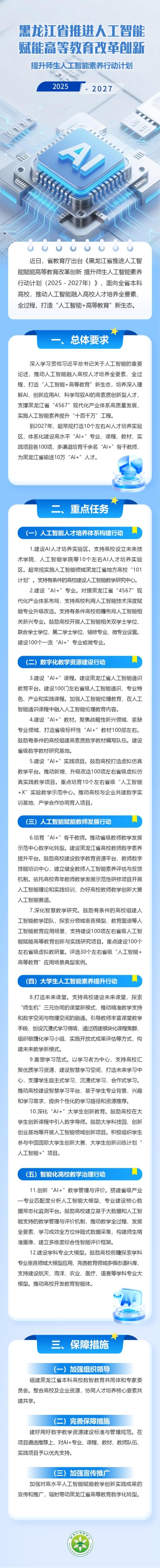 一图读懂 | 黑龙江省推进人工智能赋能高等教育改革创新 提升师生人工智能素养行动计划(2025-2027年)